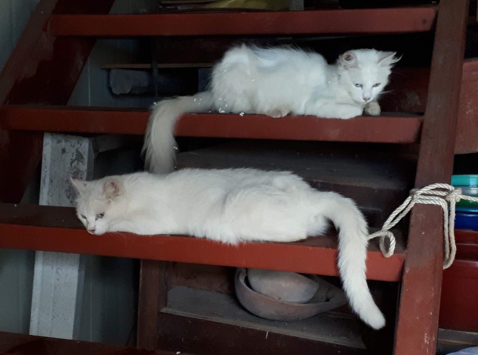 비가 내리지만 창고에서 꺼낼 것이 있어서 창고 문을 열었다. 그러자 현관문 앞에 있던 화천이와 화천이 새끼가 갑자기 창고로 뛰어 들어왔다. 현관문 앞이 습해서 그랬던 것 같다. 창고로 들어온 고양이들은 계단으로 폴짝폴짝 올라가더니 계단에 배를 깔고 엎드렸다. 2층으로 올라가야 해서 비키라고 했는데도 고양이들은 들은 체도 하지 않았다.