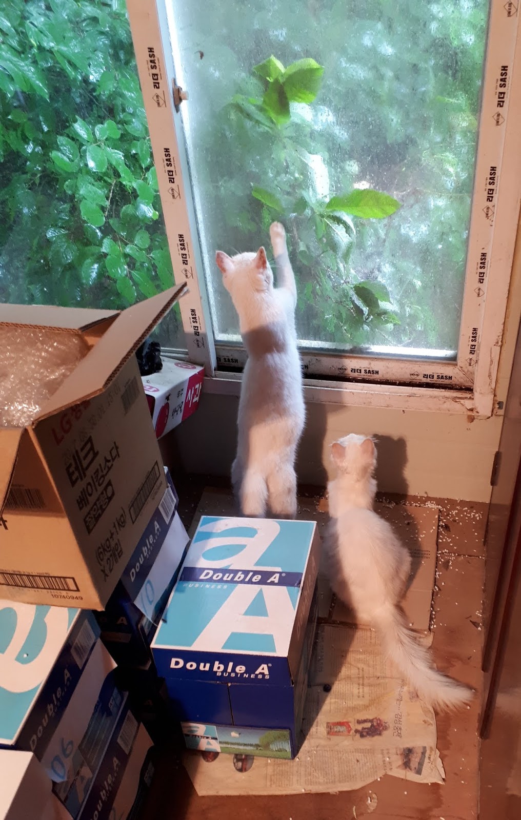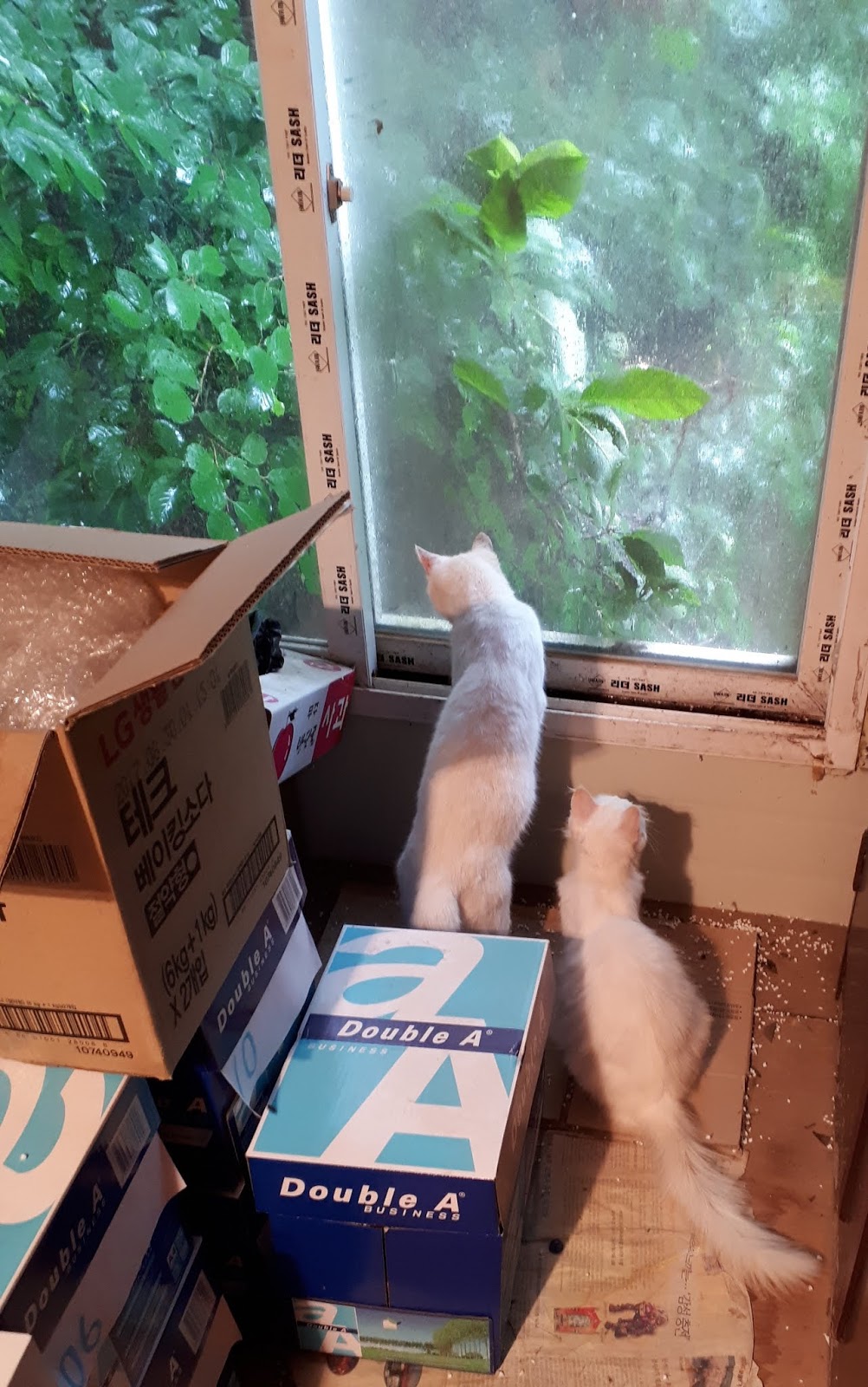 창고 문을 닫기 전에 고양이들을 창고 밖으로 내보내려고 했다. 그런데 계단에 있던 고양이들은 오히려 2층으로 올라갔다. 2층으로 올라간 고양이들은 창문을 통해 비 오는 풍경을 보았다. 현관문 앞에서 마당에 비 내리는 것을 봐도 되는데, 고양이들은 굳이 창고 2층까지 올라가서 비 오는 것을 보았다.