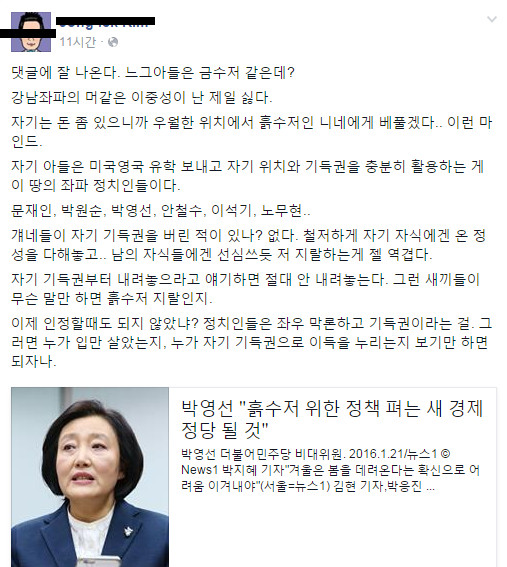 강남좌파보고 이중인격이라고 비난할 것이 아니라, 오히려 흙수저 타령 하려면 자기 기득권부터 버리고 하라고 말하는 사람이 이중인격이어야 한다. 이중인격이면 인격 중 절반은 정상일 가능성이 있는데, 지금처럼 철두철미하게 일관되면 그럴 가능성조차 없기 때문이다.